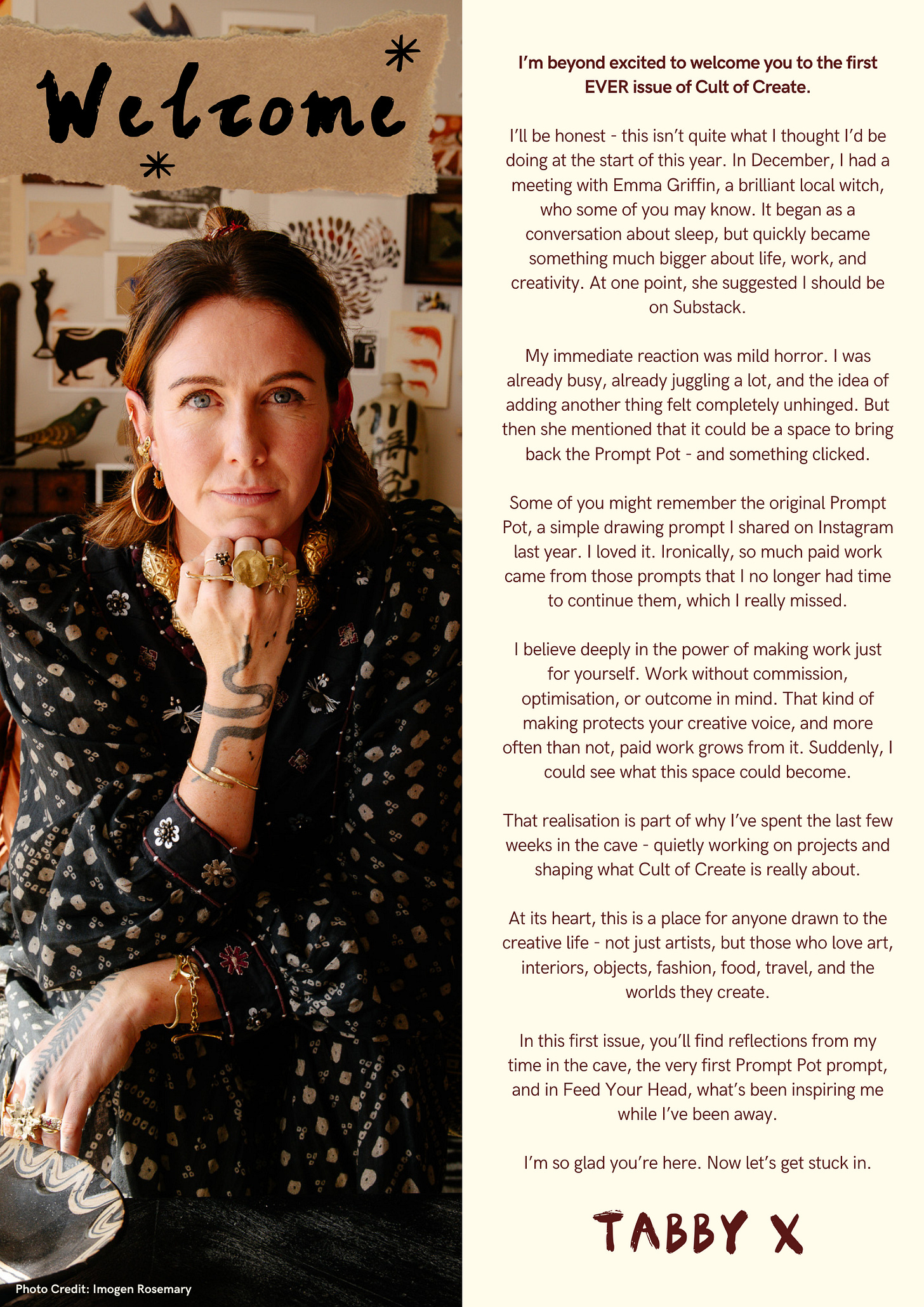The first ever issue of Cult of Create. Reflections on my three weeks in the cave: what I’ve been working on, what's inspired me, and how I ended up here. Plus the return of The Prompt Pot.